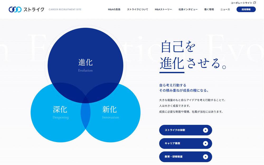 そこで私たちは「進化・深化・新化」という3つの観点をコンセプトに据え、M&Aが持つ社会的意義や経営者の想いに寄り添う姿勢を発信。特に「M&Aの真価」「M&Aへの姿勢」といったコンテンツを通じ、利益追求のためではなく、事業承継や雇用維持、地域経済の安定化といった社会貢献を重視するストライク様ならではの姿を伝えました。